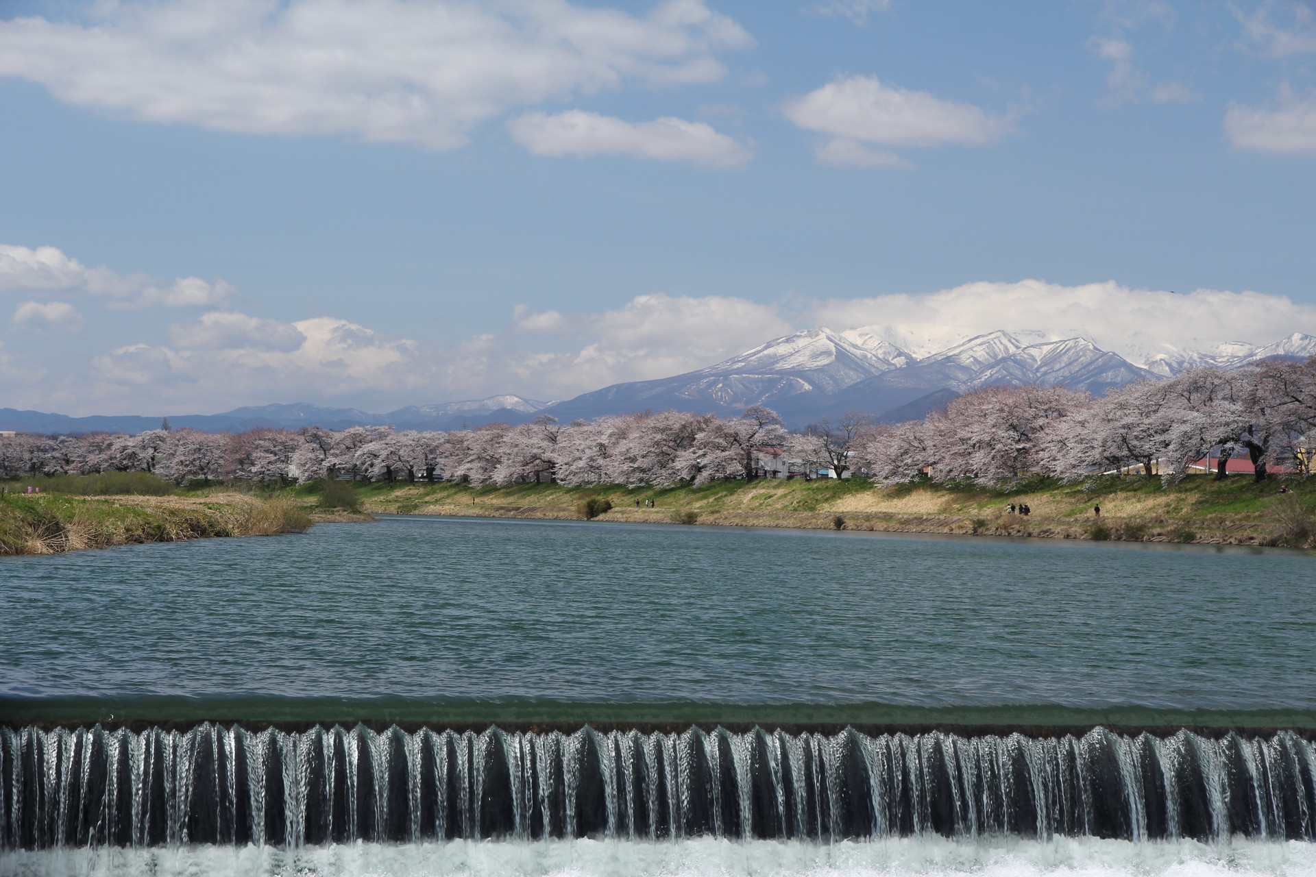 残雪の残る蔵王連峰と白石川の流れのコラボレーションが心を奪います。
